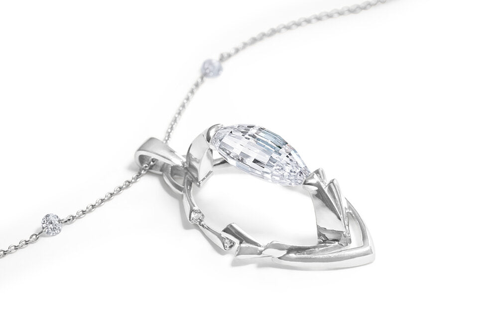El engaste de Esperanza fue obra de Ian Douglas, quien diseñó un colgante con fluidas líneas de platino que suspenden el diamante para realzar su brillo. Diamantes SIRIUS STAR® más pequeños completaron el engaste de platino fabricado por Byard F. Brogan, una empresa de Filadelfia.