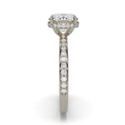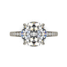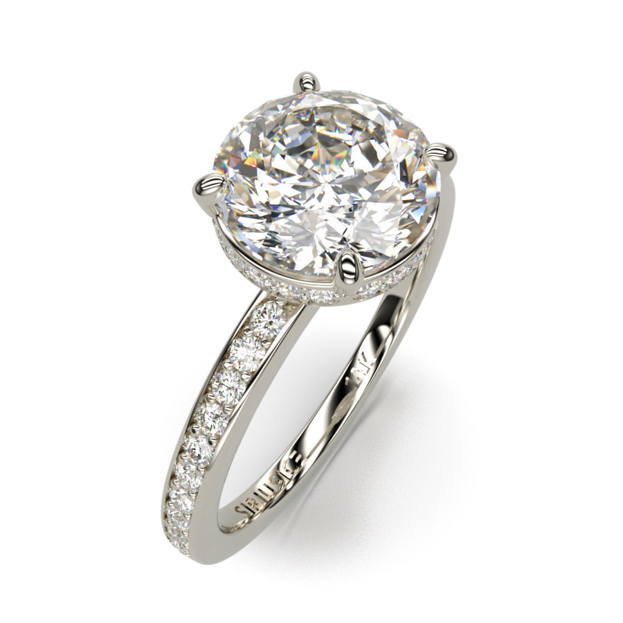 El engaste Orion realza el solitario con una delicada constelación de diamantes. Un brillante diamante central SIRIUS STAR® se sostiene en una refinada montura de cuatro garras sobre una fina banda con engaste pavé, mientras que un halo de diamantes delgado abraza la base de la corona para crear un destello de luz desde todos los ángulos.