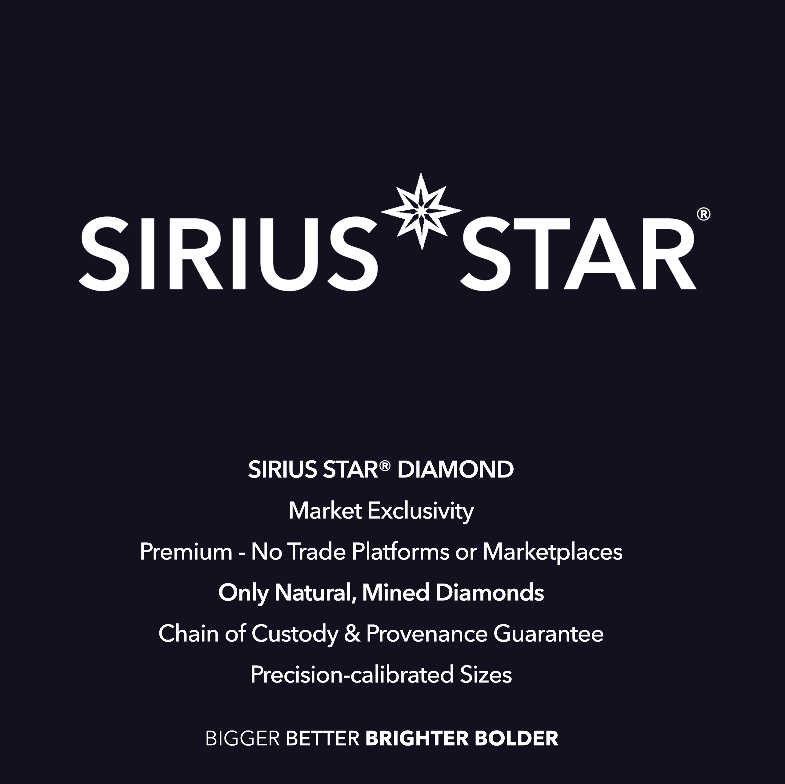 SIRIUS STAR®...EL DIAMANTE MÁS BRILLANTE DEL MUNDO® representa la evolución de la excelencia en diamantes, donde la tecnología de vanguardia se une a la artesanía tradicional para crear diamantes que superan los estándares convencionales : MÁS GRANDES, MEJORES, MÁS ATREVIDOS, MÁS BRILLANTES.